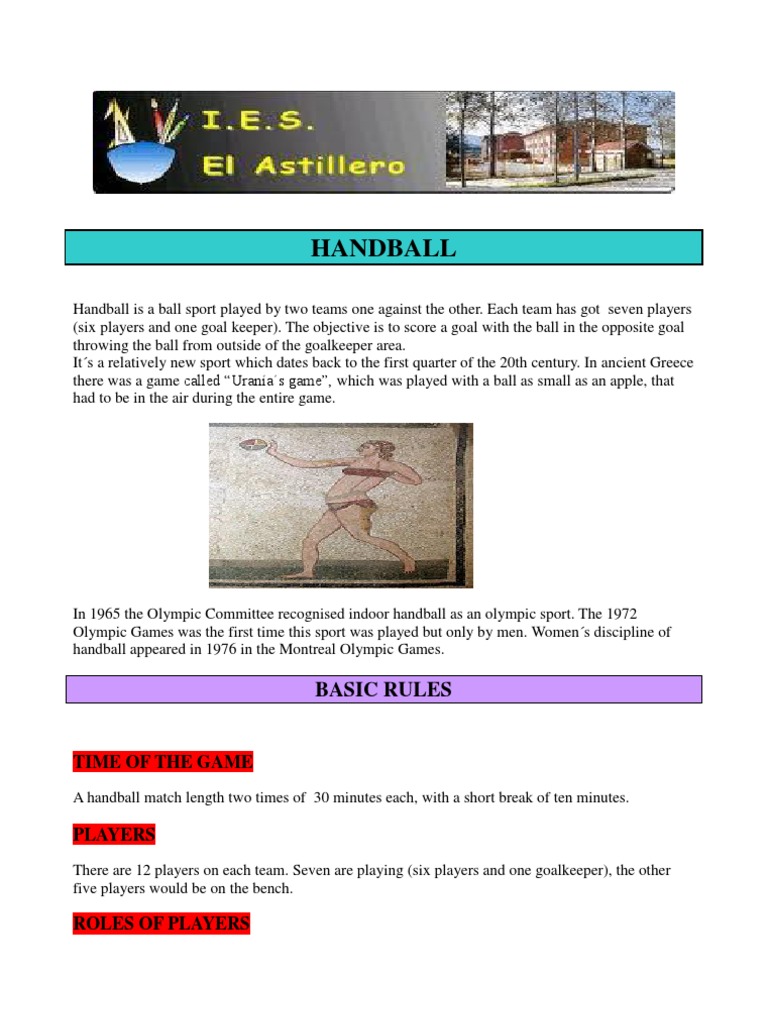 Each team consists of 7 players on the court. However, the rules apply equally to both female and male participants, except rule 3 (size of the ball). The game is split into two periods of 30 minutes, each being further divided into 15 minute intervals. A goalkeeper and 6 outfield players. Rules of the game a) indoor handball edition: General rules of handball both teams can name 14 players for a match but only 7 of them can stay on the court at once. The team that scores the most goals in a given period of time wins the match. Outfield players can touch the ball with any part of their body that is above the knee. The object is to cause the ball to rebound with variations of power or speed and at such an angle that the opposition. It requires 14 players, referees, the court, a ball, and 2 goals. According to the basic handball rules and regulations list a game lasts for 60 minutes. All games will be played in the back gyms on tuttle north all players must present their college at brockport id prior to the beginning of the event. The following rules are applicable to a game of handball: